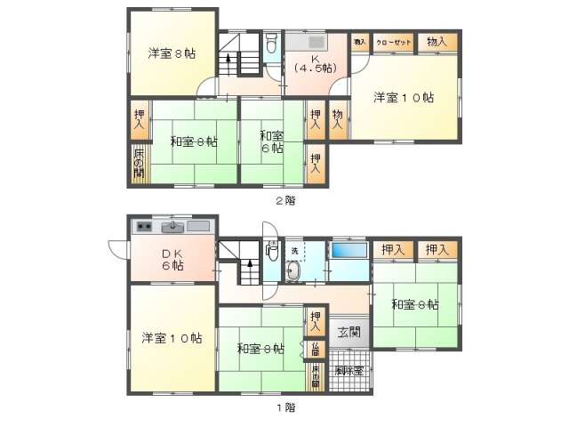 | 詳細間取 | 7DK (1階:洋10帖×1、1階:和8帖×2、2階:洋10帖×1、2階:洋8帖×1、2階:和8帖×1、2階:和6帖×1、1階:DK6帖) | ||