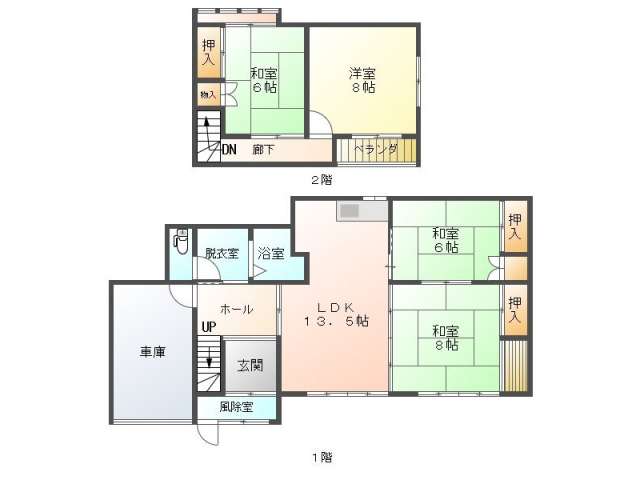 | 詳細間取 | 4LDK (1階:和8帖×1、1階:和6帖×1、2階:洋8帖×1、2階:和6帖×1、1階:LDK13.5帖) | ||