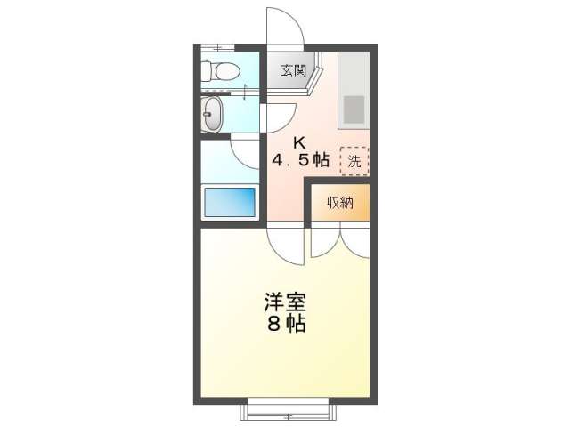 | 詳細間取 | 1K (洋8帖×1、キッチン4.5帖) | ||