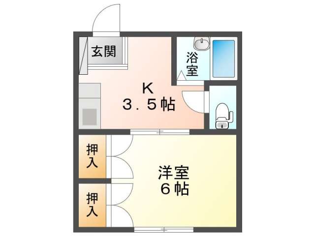 | 詳細間取 | 1K (洋6帖×1、キッチン3.5帖) | ||