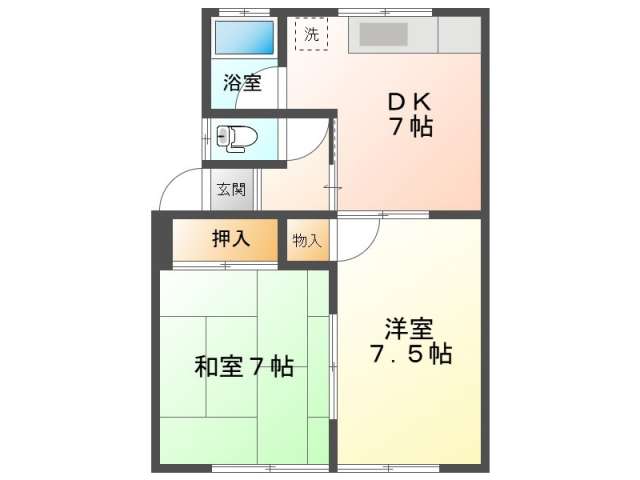 | 詳細間取 | 2DK (和8帖×1、洋7.5帖×1、DK7帖) | ||